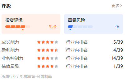 巨星科技的市盈率TTM为18☆▷◁.8,市净率为2.39,成长能力4星,盈利能力4星半,业务控制力3星,估值星级4星,属于合理空间范畴。