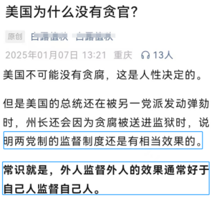 但公知依然不死心▷◆,还在变着花样给美国的腐败洗地◁•★。有人说○○-,“美国两党制的监督制度还是有相当效果的☆”,“常识就是,外人监督外人的效果通常好于自己人监督自己人”。顺着公知的逻辑,越是外人监督效果就越好的话==□,那美国是不是该考虑让俄罗斯人来监督呢▲▷▽,比起抬头不见低头见的监督共和党,又或共和党监督,监督效果岂不是更好?这是◆•=“常识”嘛。